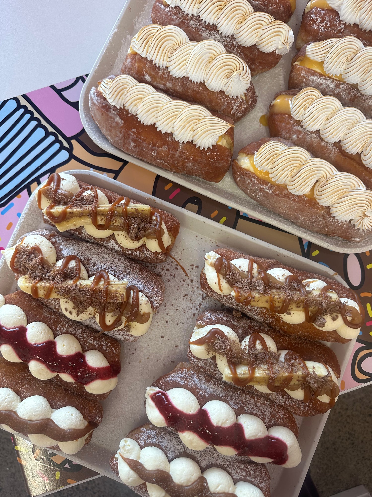 our 'longbois' (cream donuts) and OG pink roundies are what made us famous, and we now offer a whole range of delicious treats, many styles and flavours of donuts. sticky cinnamon scrolls, cheesecakes, tarts, brownies, NYC cookies and so much more.
